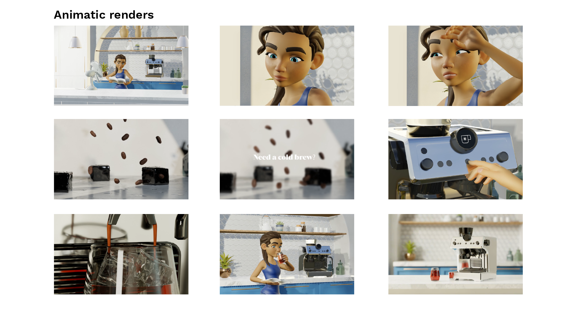 Our process always starts with extensive research. We looked at what De’Longhi is currently doing online and decided to break away from their normal marketing Look & Feel, while still staying sleek, sophisticated and selling effortless beauty. After getting references and inspiration online, we sketched out the key scenes and started constructing the kitchen in Blender. The video introduces a new approach to the typical social recipe follow-along post, giving us a chance to show off our condensation and liquid simulations.